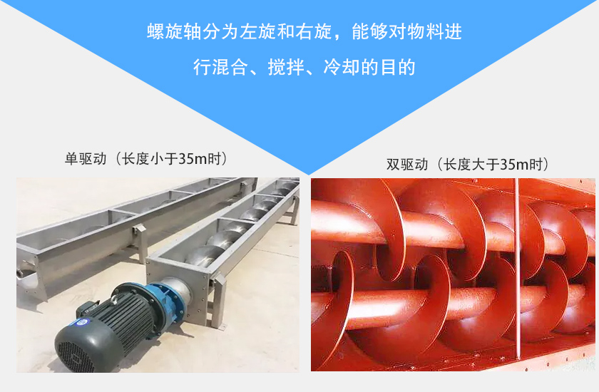 絞龍螺旋輸送機(jī)主要是由機(jī)架、進(jìn)出口裝置、驅(qū)動裝置(減速機(jī)或電機(jī))、螺旋軸、螺旋葉片、軸聯(lián)(或鏈輪、鏈條或皮帶輪、三角帶)、頭節(jié)、中間節(jié)、軸承座、吊軸承、尾節(jié)等不等組成。