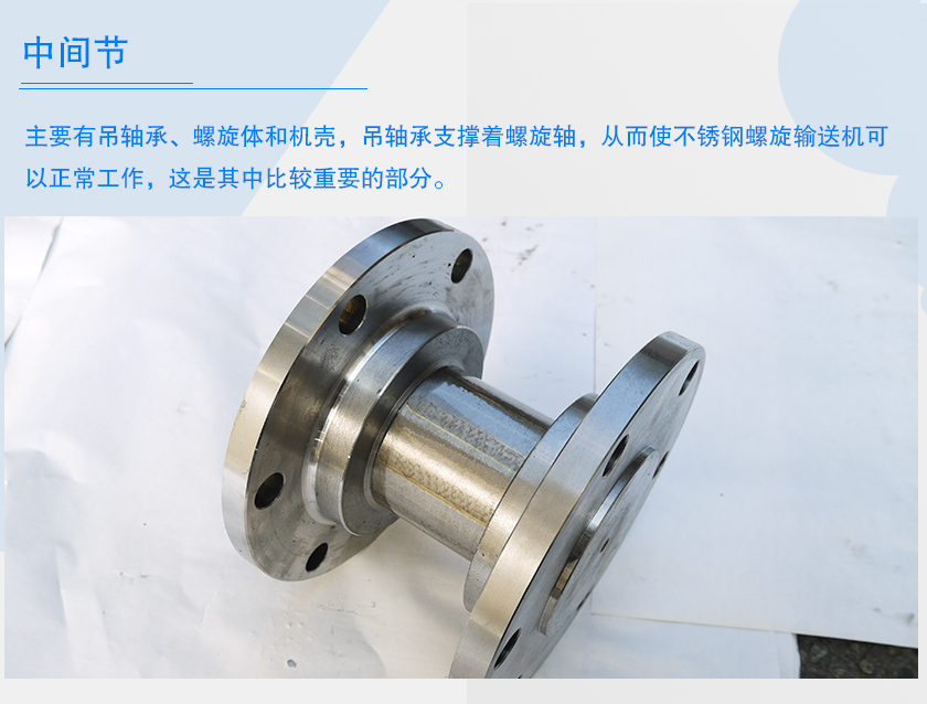 中間節(jié):主要有吊軸承、螺旋體和機殼,吊軸承支撐著螺旋軸,從而使不銹鋼螺旋輸送機可以正常工作,這是其中比較重要的部分。