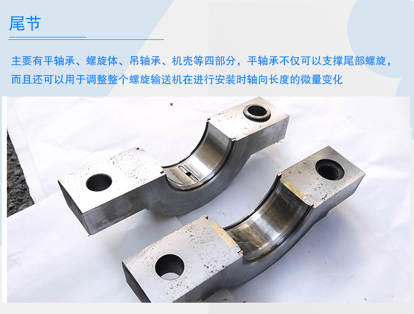 尾節(jié):主要有平軸承、螺旋體、吊軸承、機殼等四部分,平軸承不僅可以支撐尾部螺旋,而且還可以用于調整整個螺旋輸送機在進行安裝時軸向長度的微量變化。