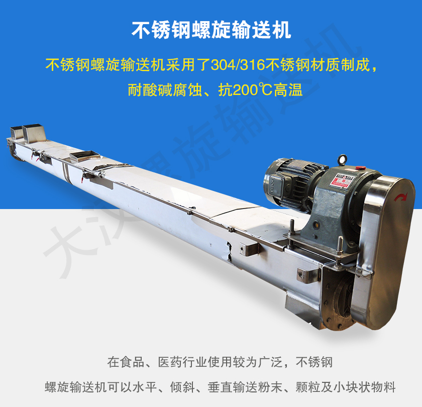 不銹鋼螺旋輸送機廣泛應用于食品、醫(yī)藥、建材、化工、電力、冶金、煤礦炭、糧食等行業(yè),適用于水平或傾斜輸送粉狀、粒狀和小塊狀物料,尤其適合食品、醫(yī)藥行業(yè),可以滿足行業(yè)衛(wèi)生標準,可輸送諸如面粉、飼料、花椒粉、藥粉等對衛(wèi)生要求嚴格的物料。