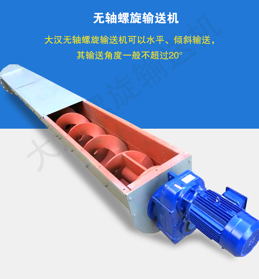 無(wú)軸螺旋輸送機(jī)廣泛應(yīng)用于建材、冶金、化工、糧食等行業(yè),用于輸送粘性高、易于纏繞的粉末、顆粒及小塊狀物料,其輸送角度應(yīng)小于20°,采用特制襯板,可在高溫下工作。