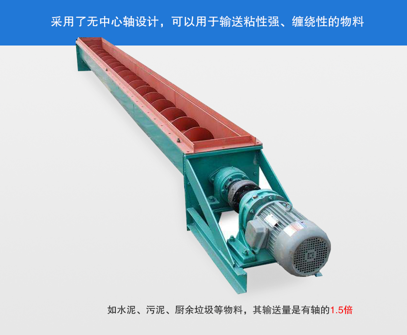 無(wú)軸螺旋輸送機(jī)采用無(wú)中心軸設(shè)計(jì),可輸送傳統(tǒng)有軸螺旋輸送機(jī)和皮帶輸送機(jī)不能或不易輸送的物料,如顆粒狀和粉狀物料、濕的和糊狀物料、半流體和粘性物料、易纏繞和易堵塞物料、有特殊衛(wèi)生要求的物料。