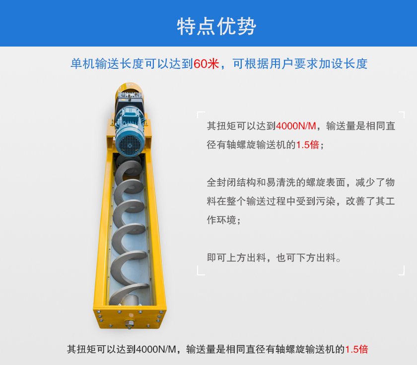 2、其扭矩可以達(dá)到4000N/m,輸送量是相同直徑有軸螺旋輸送機(jī)的1.5倍;