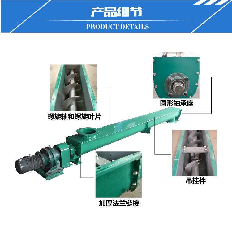 無(wú)軸螺旋輸送機(jī)采用無(wú)軸葉片,當(dāng)物料從輸送機(jī)的進(jìn)料口進(jìn)入,依靠電機(jī)帶動(dòng)螺旋葉片的旋轉(zhuǎn)將物料推移滑行,沿U型輸送槽送至出料口,并與壓榨機(jī)或垃圾小車配套,將物料進(jìn)行下一步處理。
