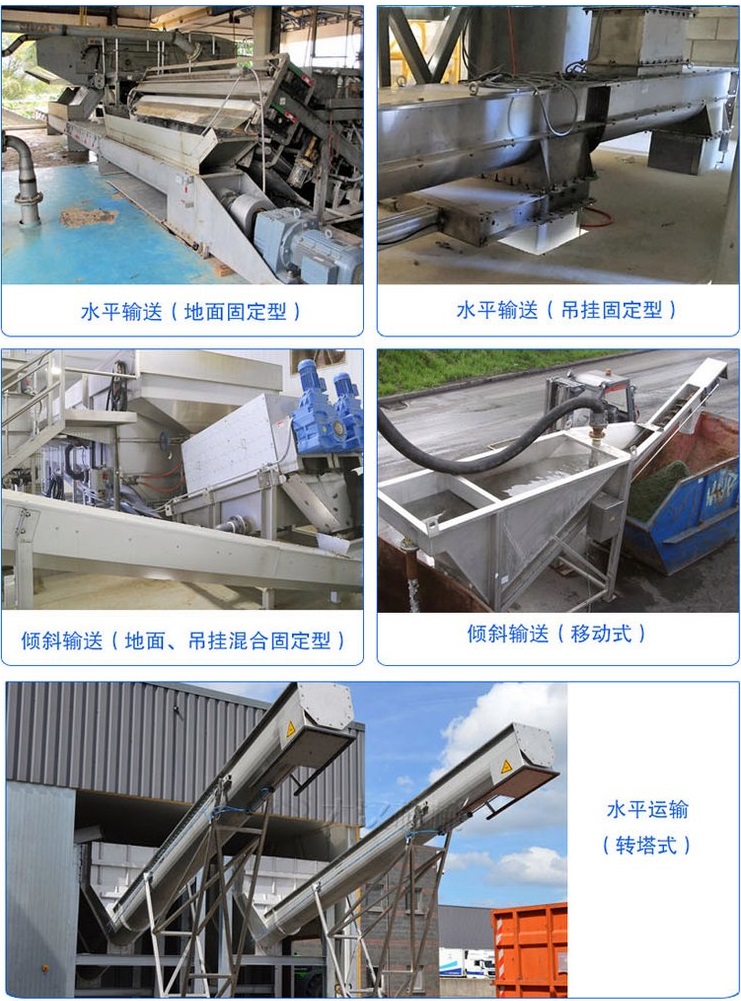 主要用于污水處理、垃圾回收中,廣泛用于化工、食品、醫(yī)藥、造紙、飲料等行業(yè)輸送附著力強(qiáng)、膏狀粘性物料(如化工原料、廢紙漿、麥芽、污泥、等)纏繞材料(如生活垃圾)。