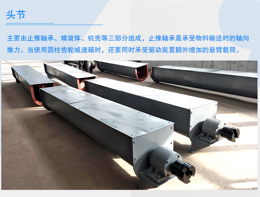 頭節(jié):主要由止推軸承、螺旋體、機殼等三部分組成,止推軸承是承受物料輸送時的軸向推力。當使用圓柱齒輪減速箱時,還要同時承受驅動裝置額外增加的懸臂載荷。
