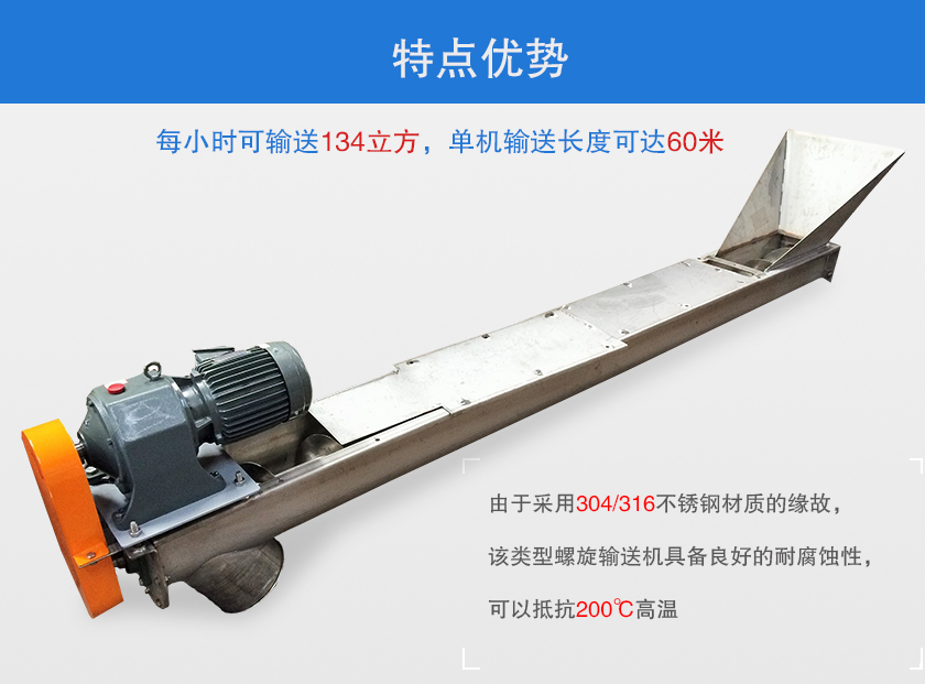 3、由于采用304/316不銹鋼材質的緣故,該類型螺旋輸送機具備良好的耐腐蝕性,可以抵抗200℃高溫;